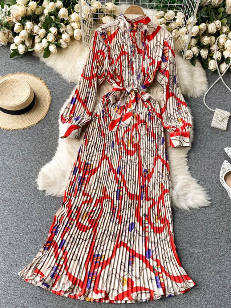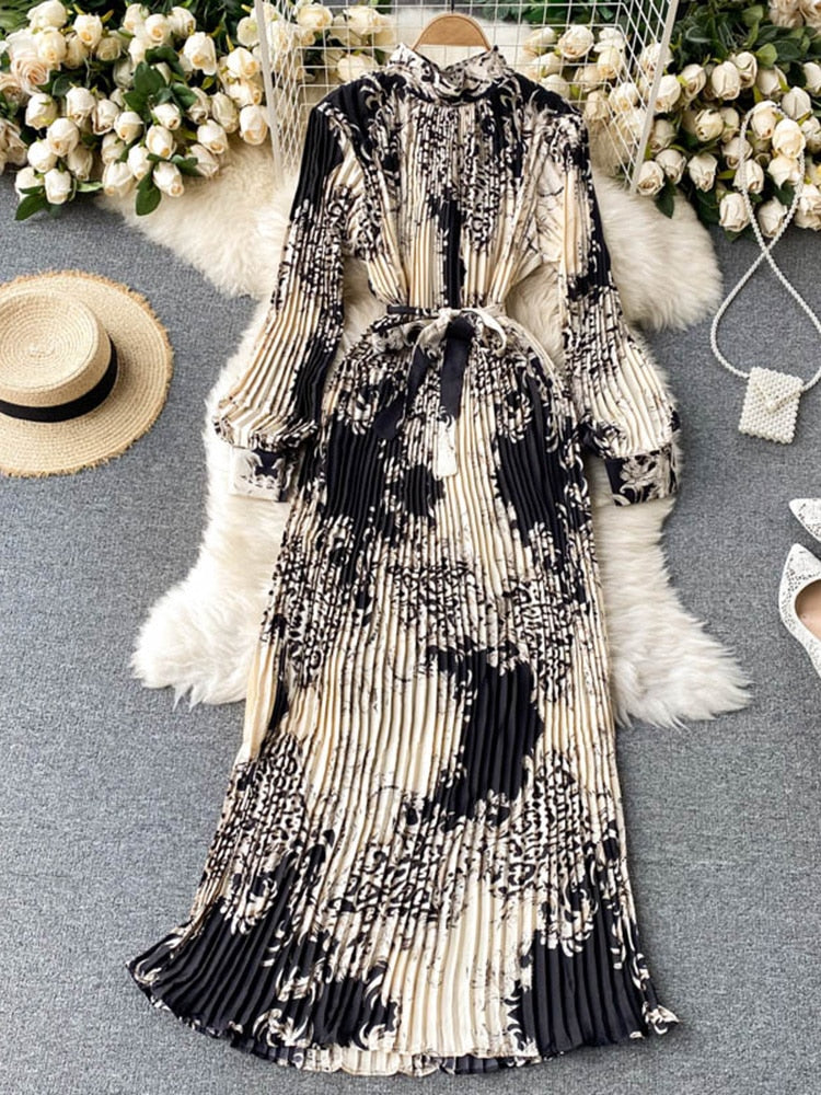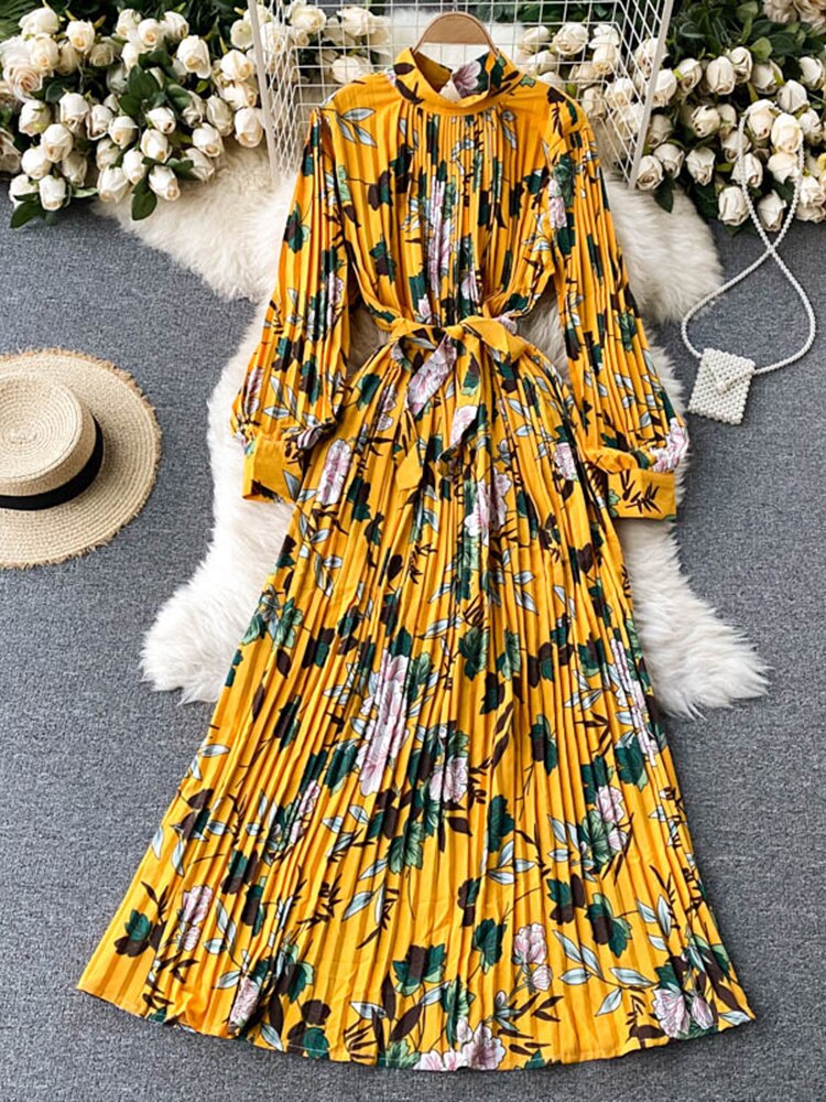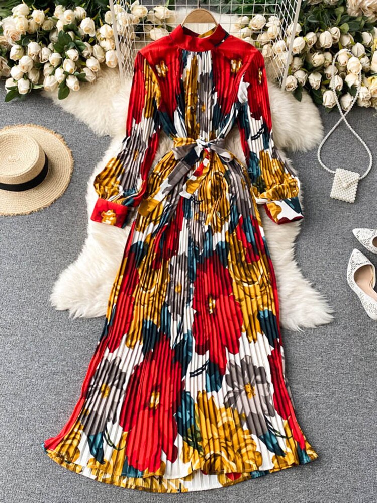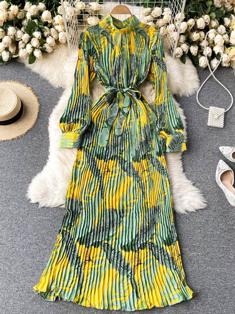 Long maxi femininity dress with stand collar and puff sleeves slim
