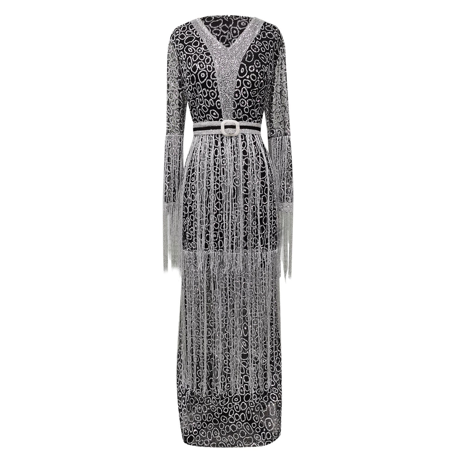 New Elegant Silver Maxi Party DresseLong Sleeve Sexy Lace V Neck Long Dresses Sequins