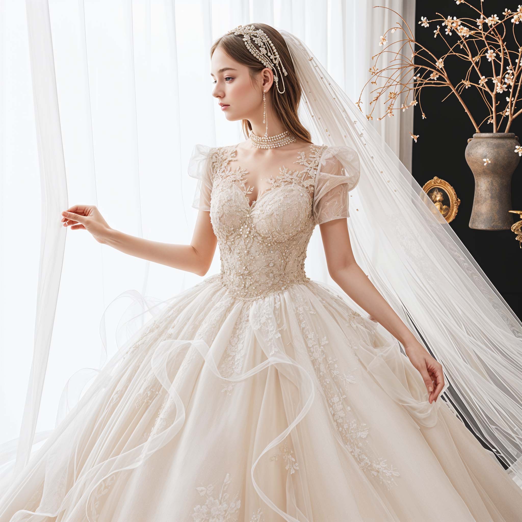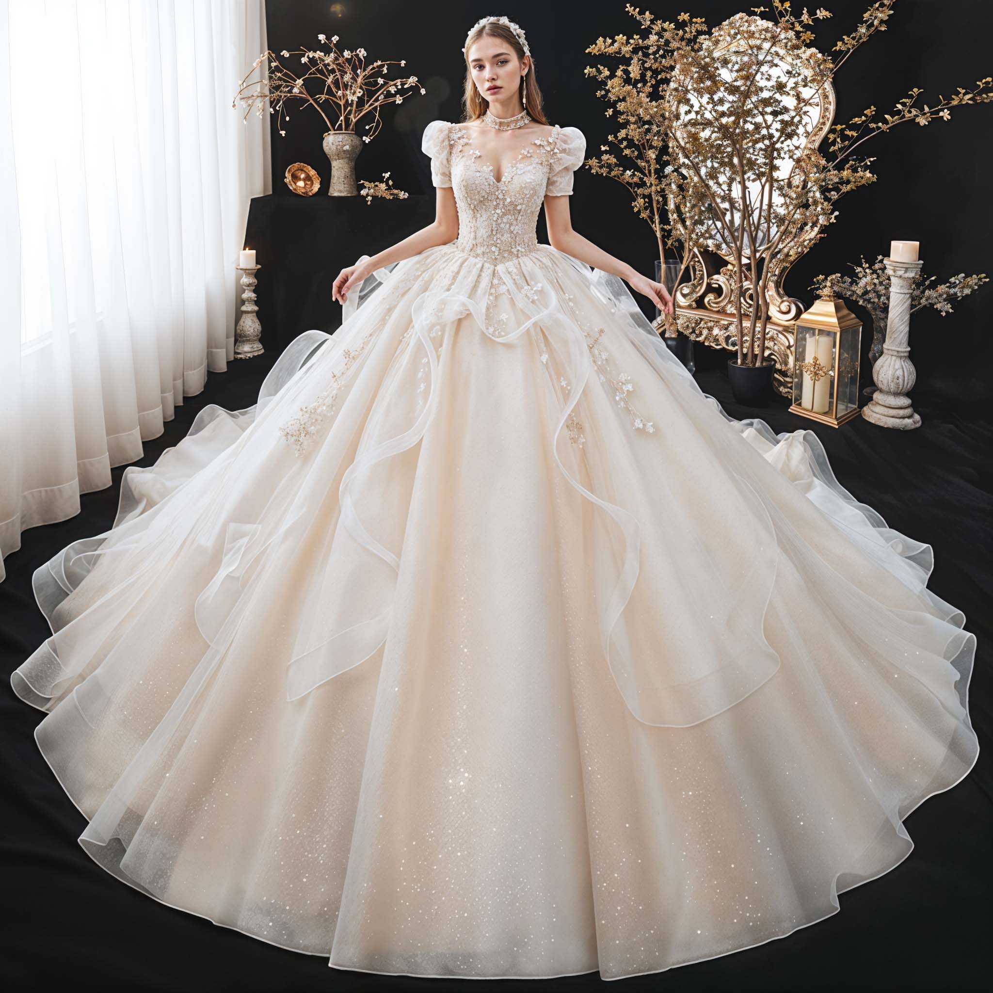 Luxurious short-sleeved wedding dress with embellishment and floral appliqué