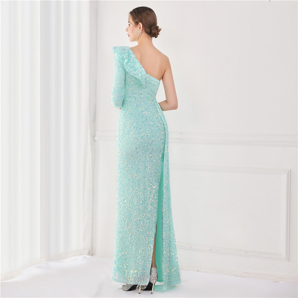 Dress Women Sequins Party Sexy One Shoulder Ruffles Evening Maxi Side Long Blue Dress
