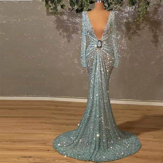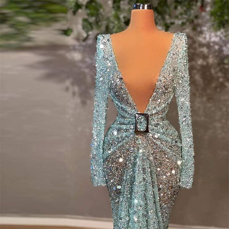 New Elegant Silver Maxi Party DresseLong Sleeve Sexy Lace V Neck Long Dresses Sequins