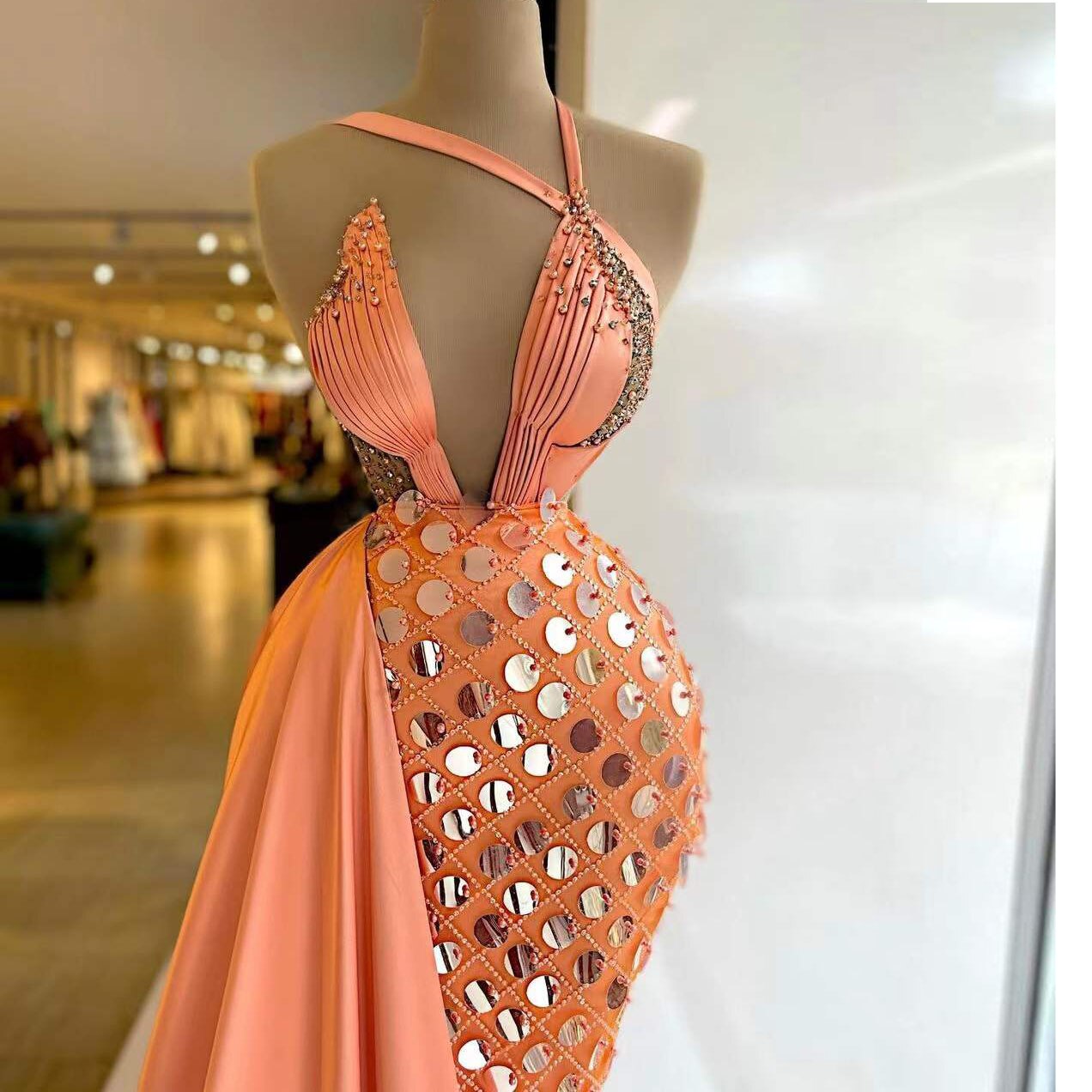 Prom Dresses Deep V Neck Sequins Beading Long Sleeve Pleated Long Mermaid