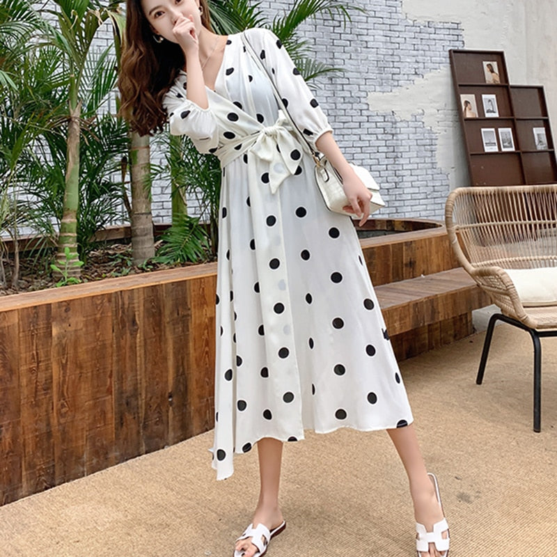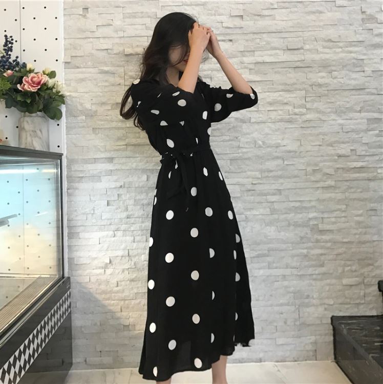 Vestido largo con cuello en V para mujer Vestido casual de lunares con media manga