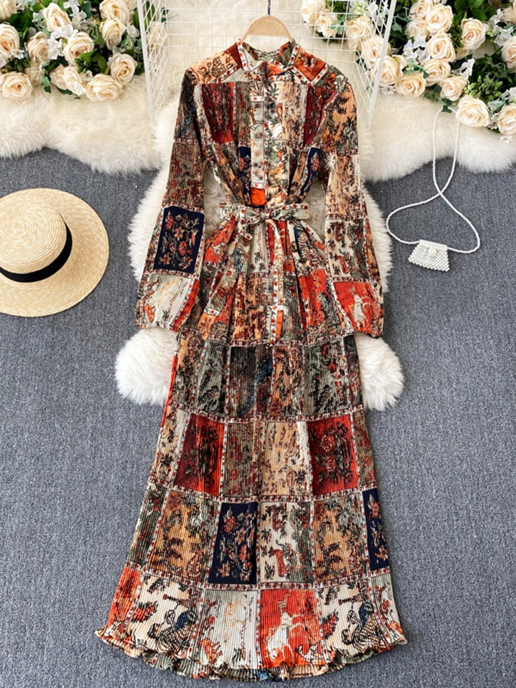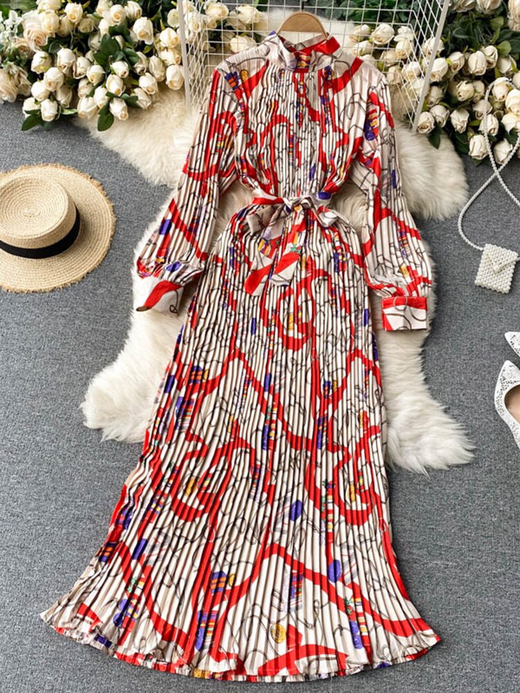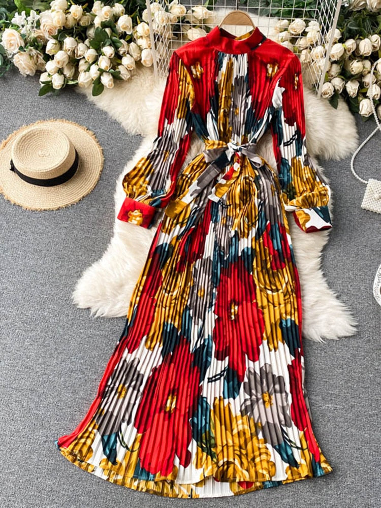 New Dress Temperament Turtleneck Waist Slim Long Sleeves Lace Up Wild Floral Maxi