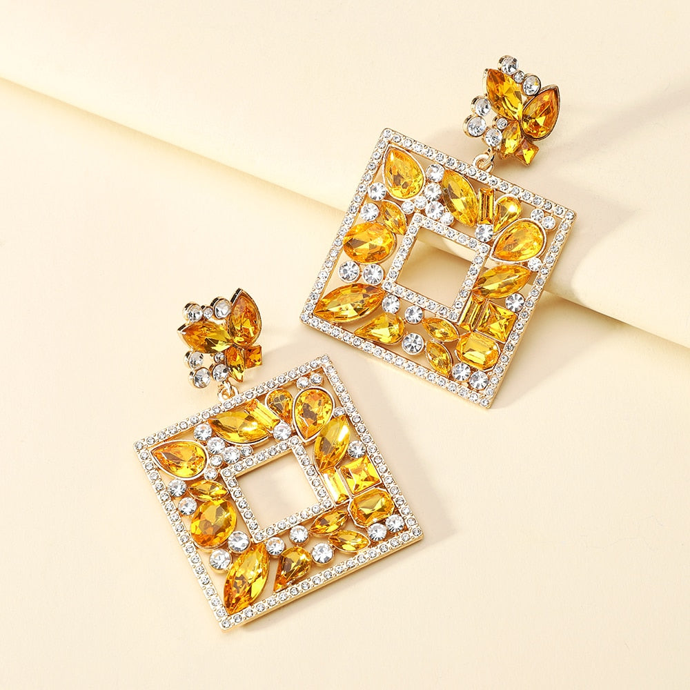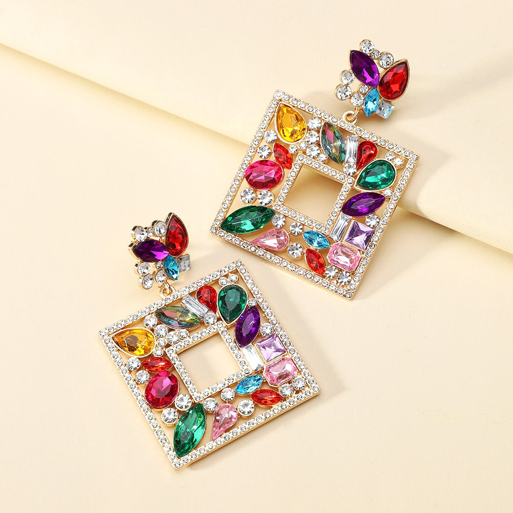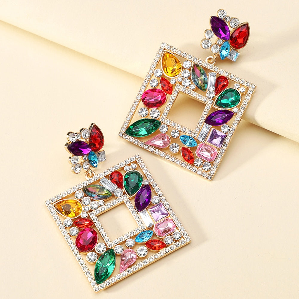 Square Metal Sparkly Colorful Crystal Large Dangle Earring Trendy Boho Luxury Design