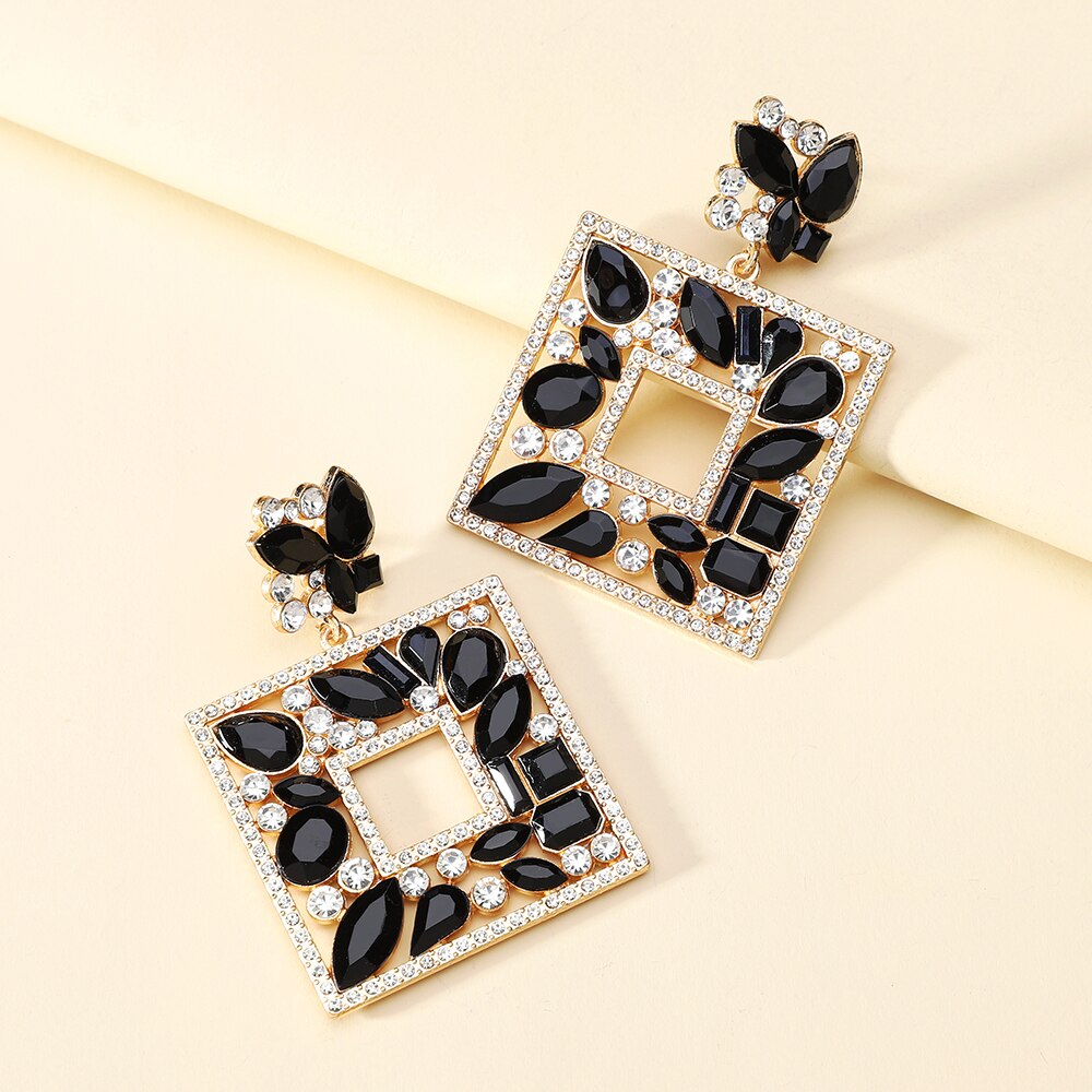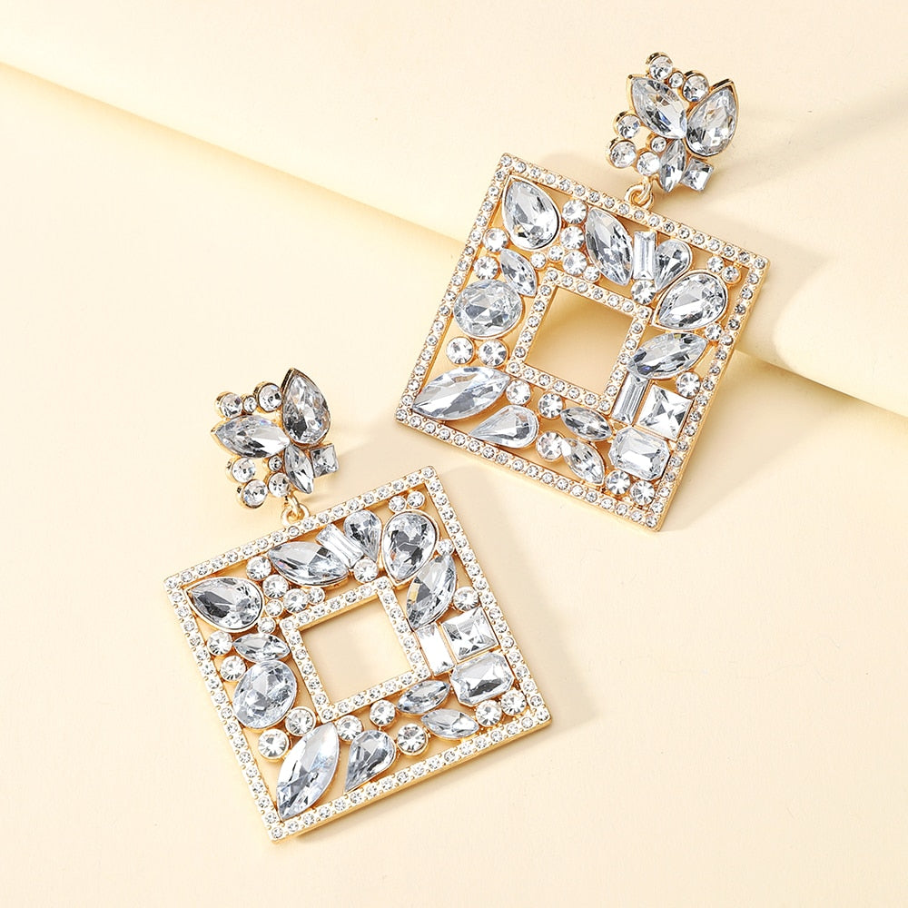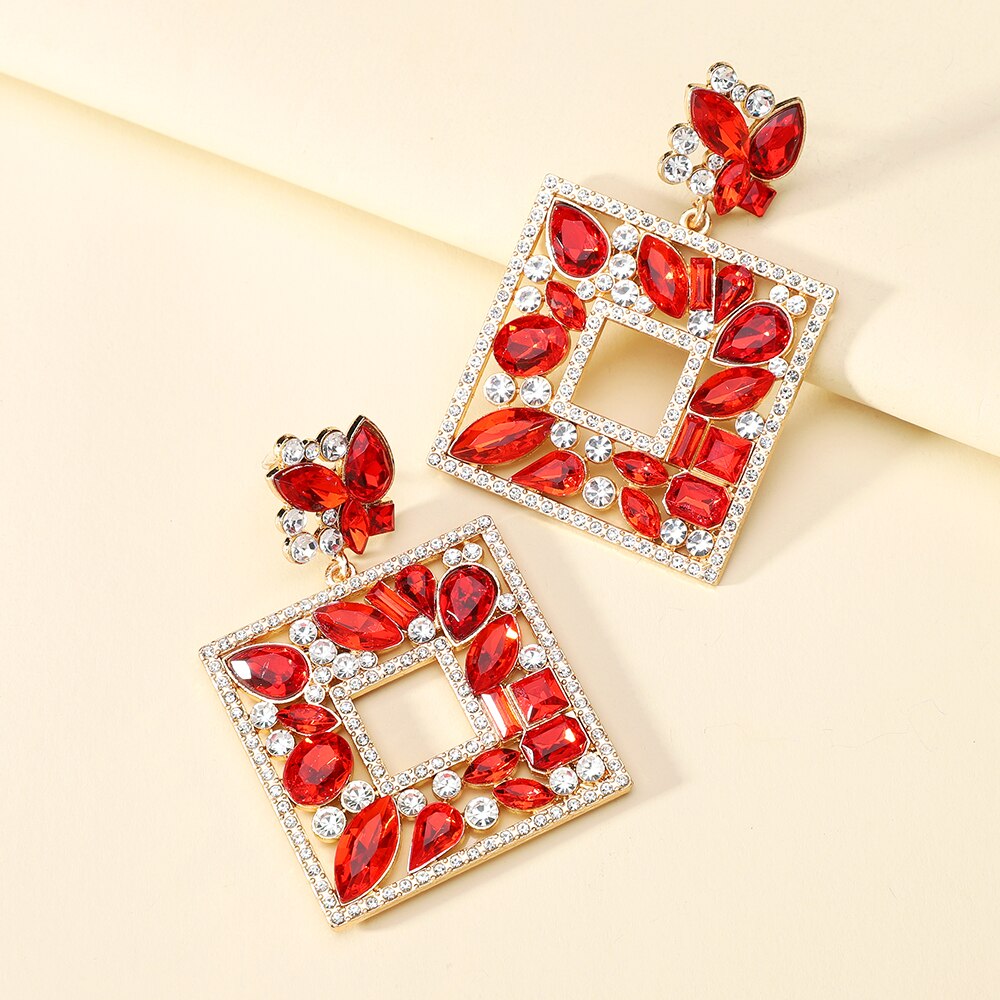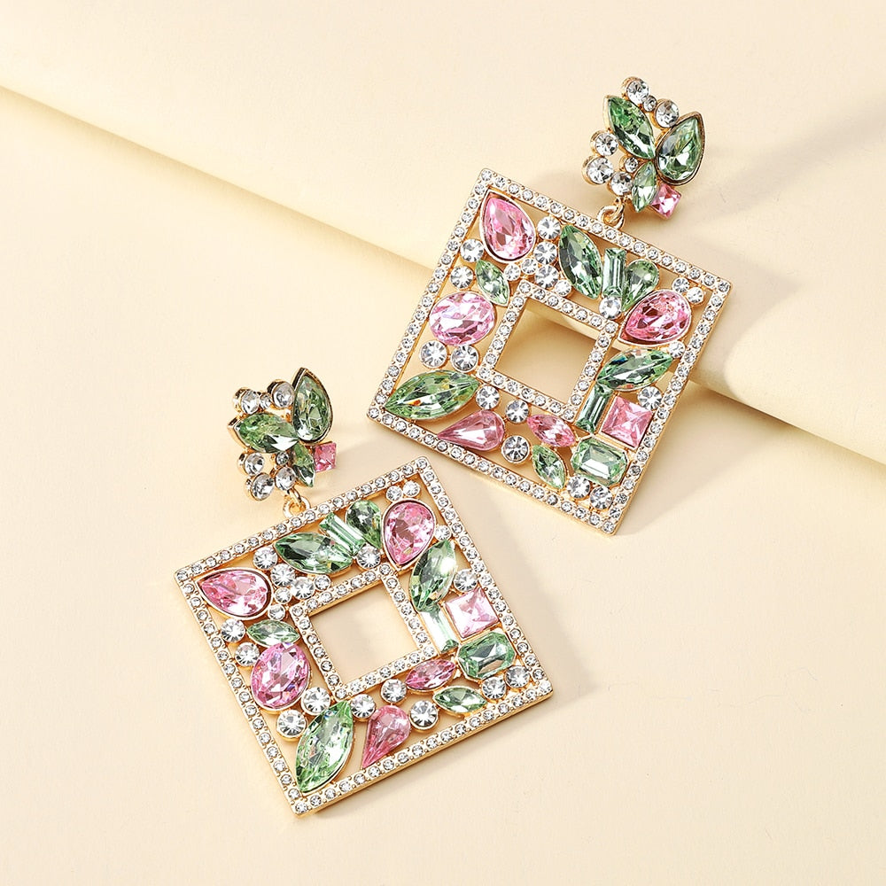 Square Metal Sparkly Colorful Crystal Large Dangle Earring Trendy Boho Luxury Design