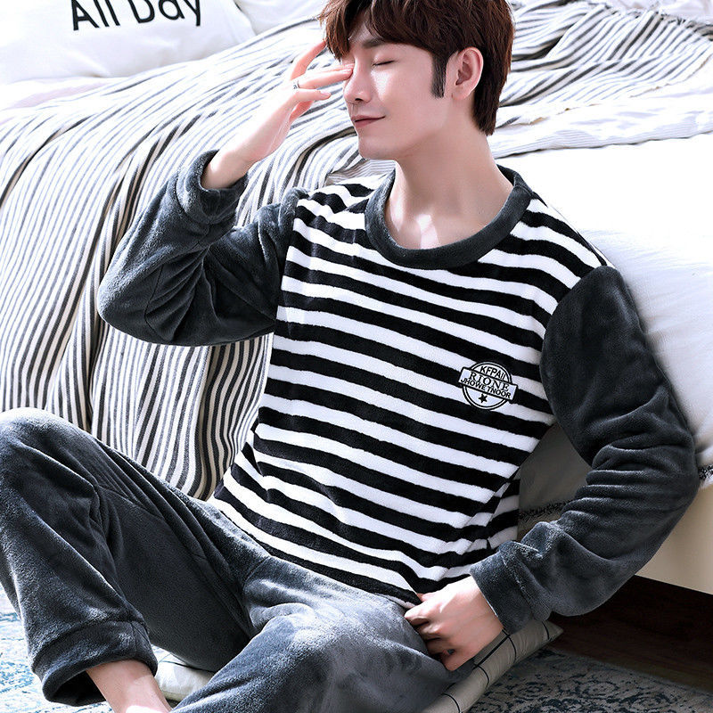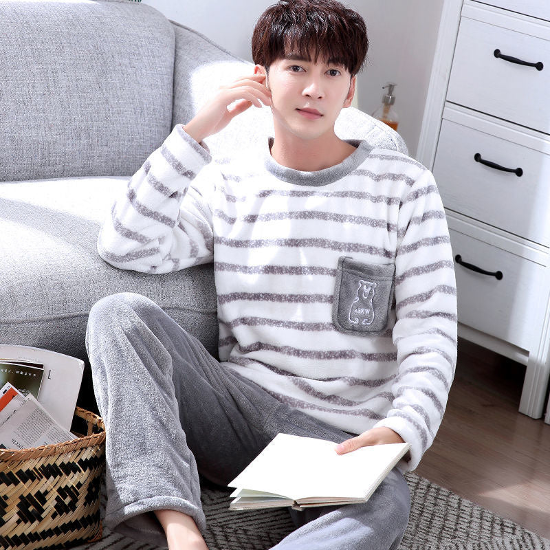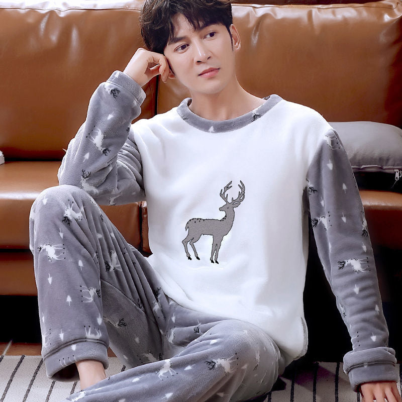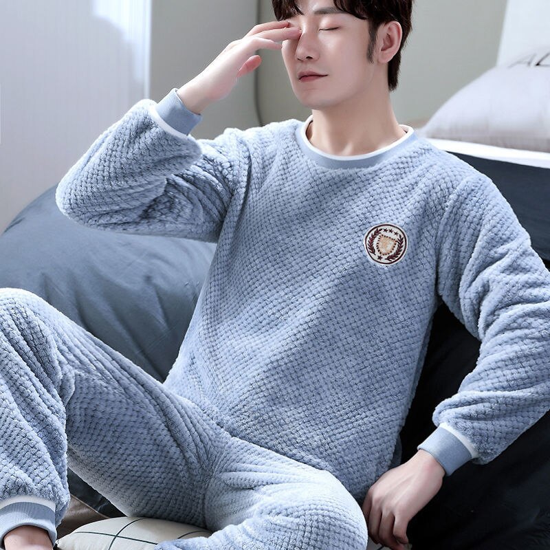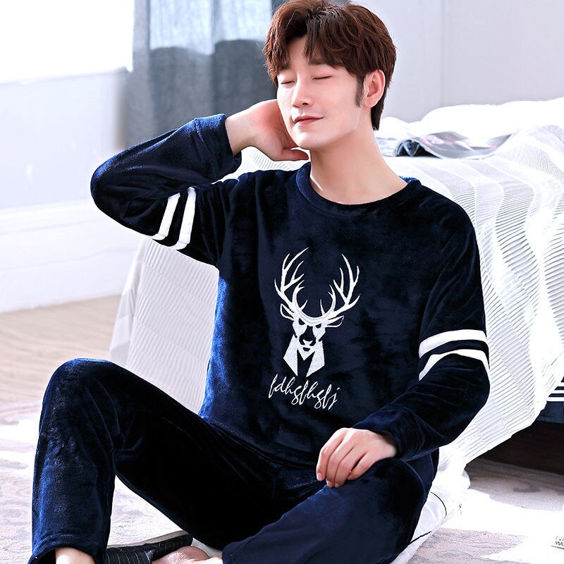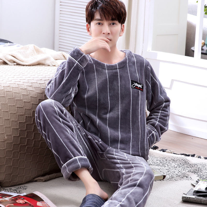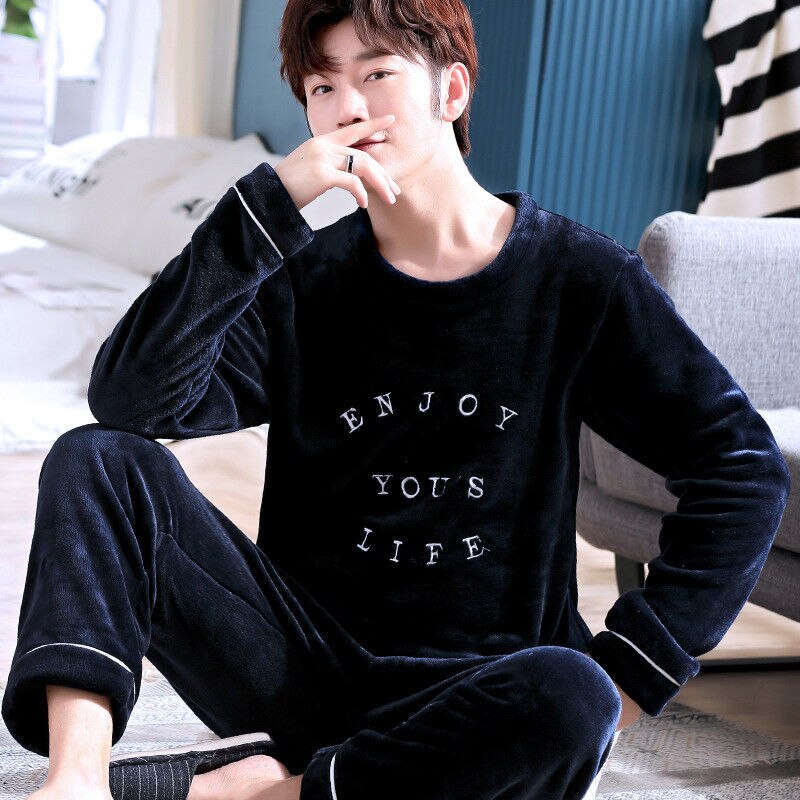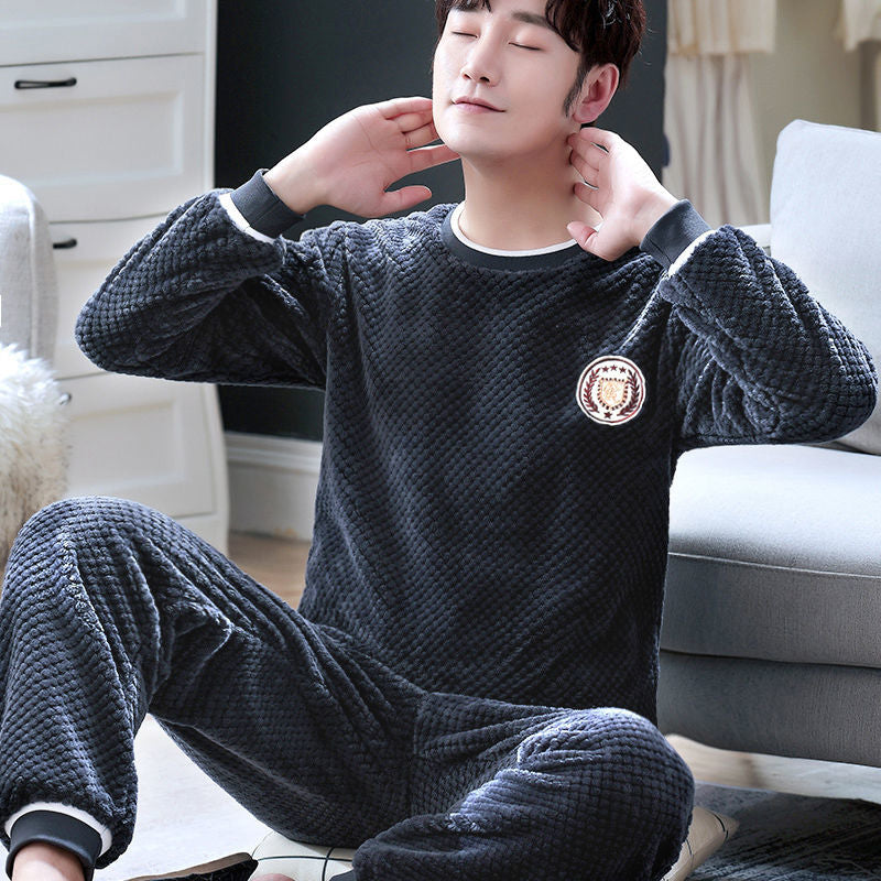 Men Pajamas Autumn Winter Flannel O-Neck Long Sleeve Trousers Two-piece Suit