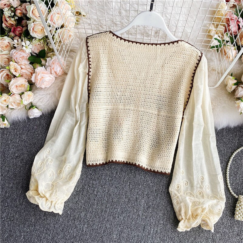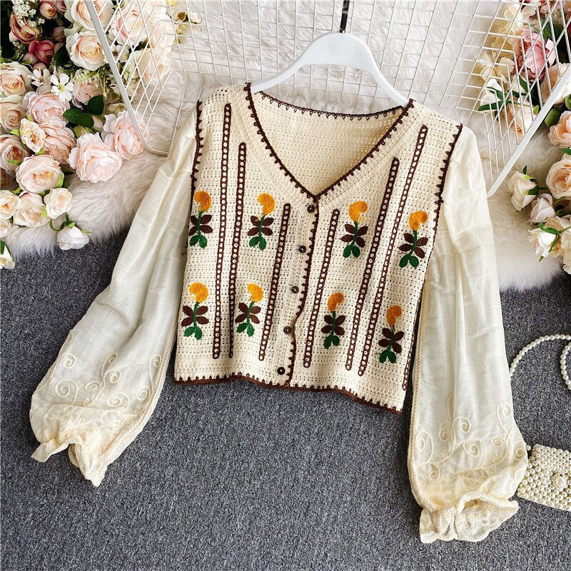 Embroidery V-neck Long Shirt Temperament Sweet and Wild Short Blous