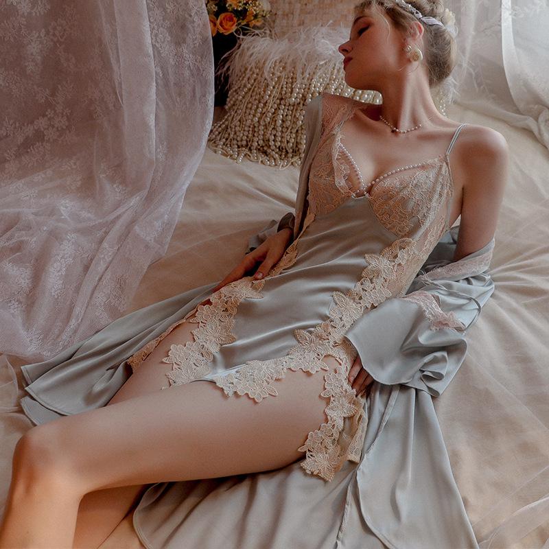 Black Lace Nightgown Set for Women Sleepwear Satin Kimono