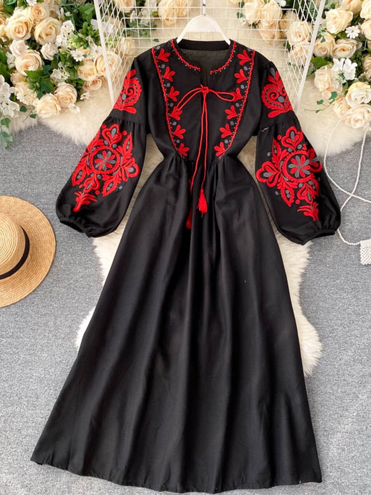Women's bohemian floral embroidered dress with round neck and high waisted lantern sleeves