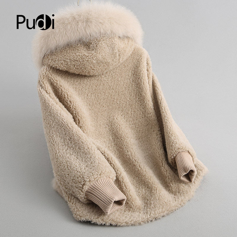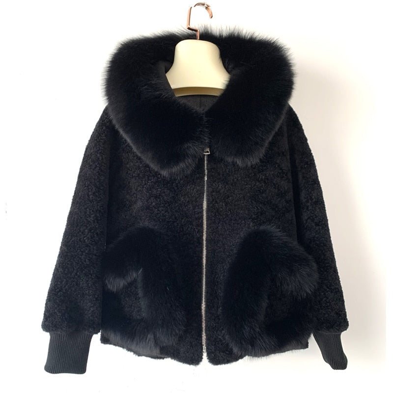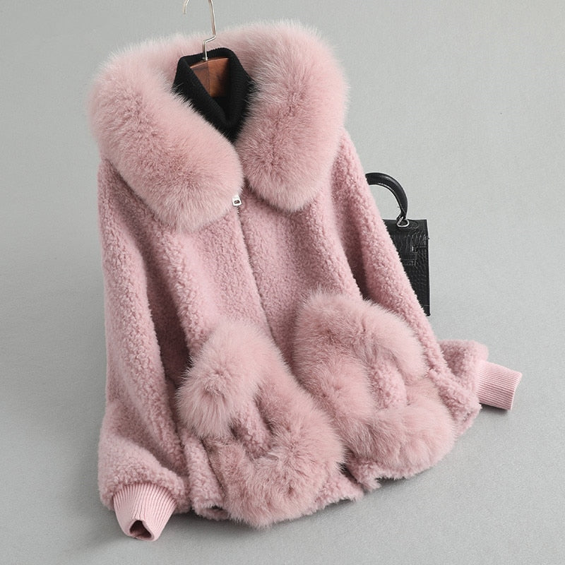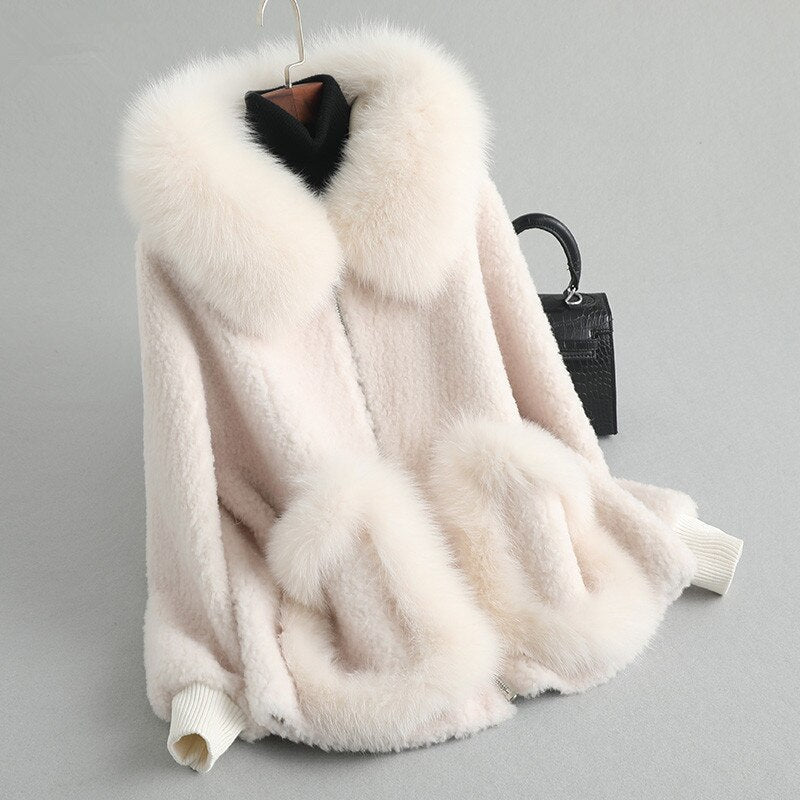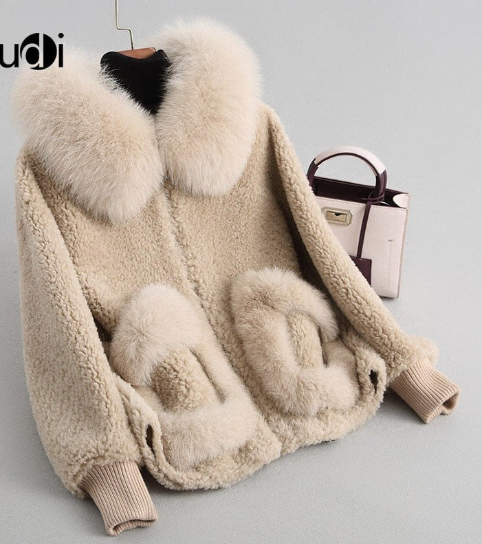 Women's winter warm real fox fur coat woolen coat